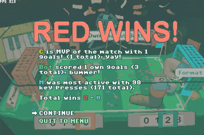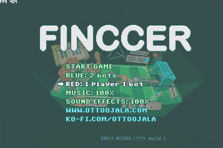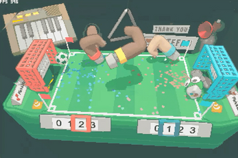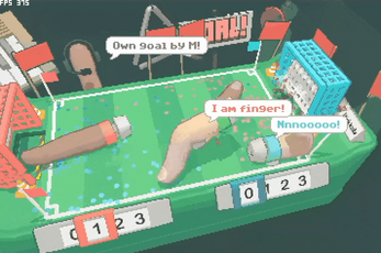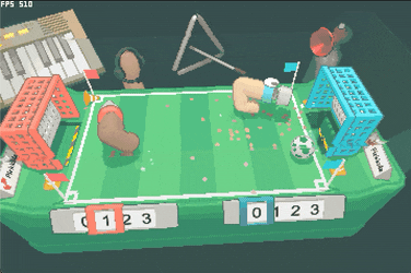 One-button 1-4 players local-multiplayer finger football. Push the button to extend the finger, release to bend, idle to relax. Keep pressed while grounded to roll back-side up. Spam to add forward force. Score 3 goals to win the round.